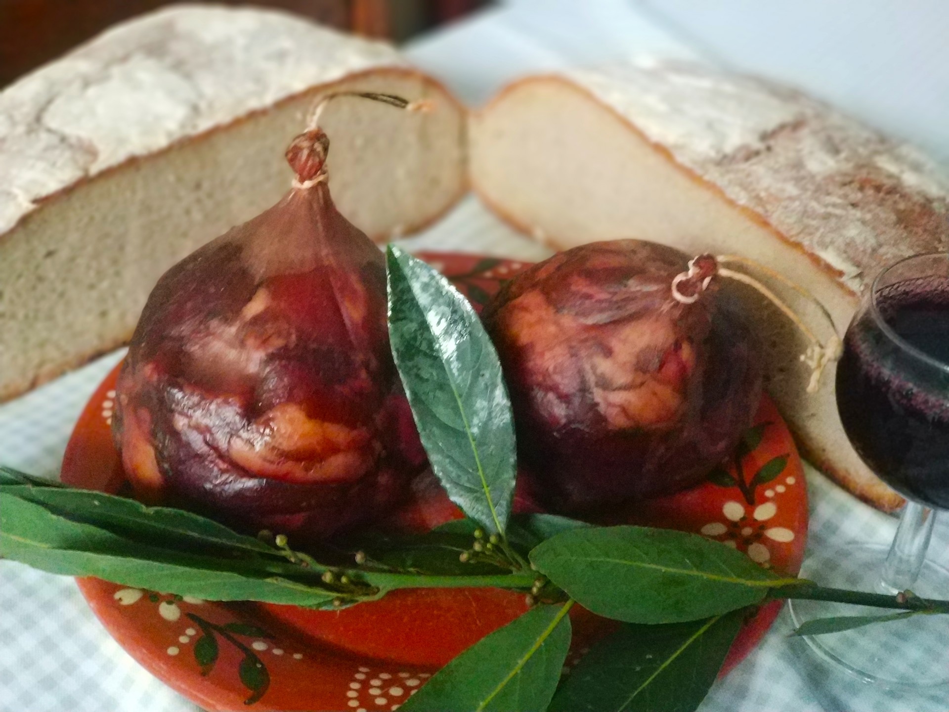 Enchidos, pão rústico, taça de vinho e folhas verdes em prato decorativo